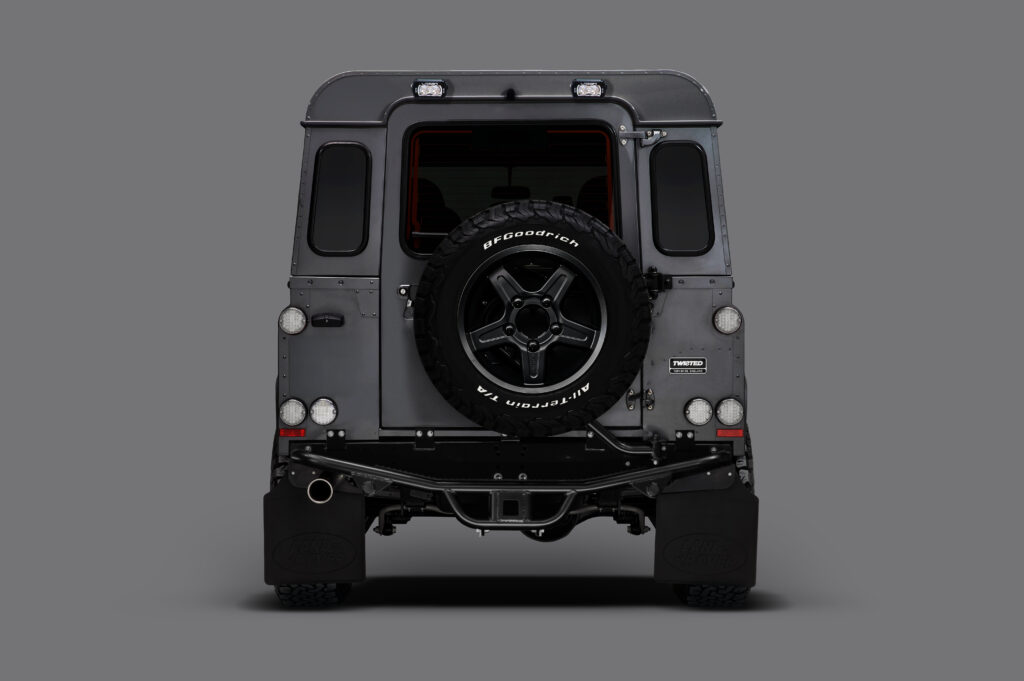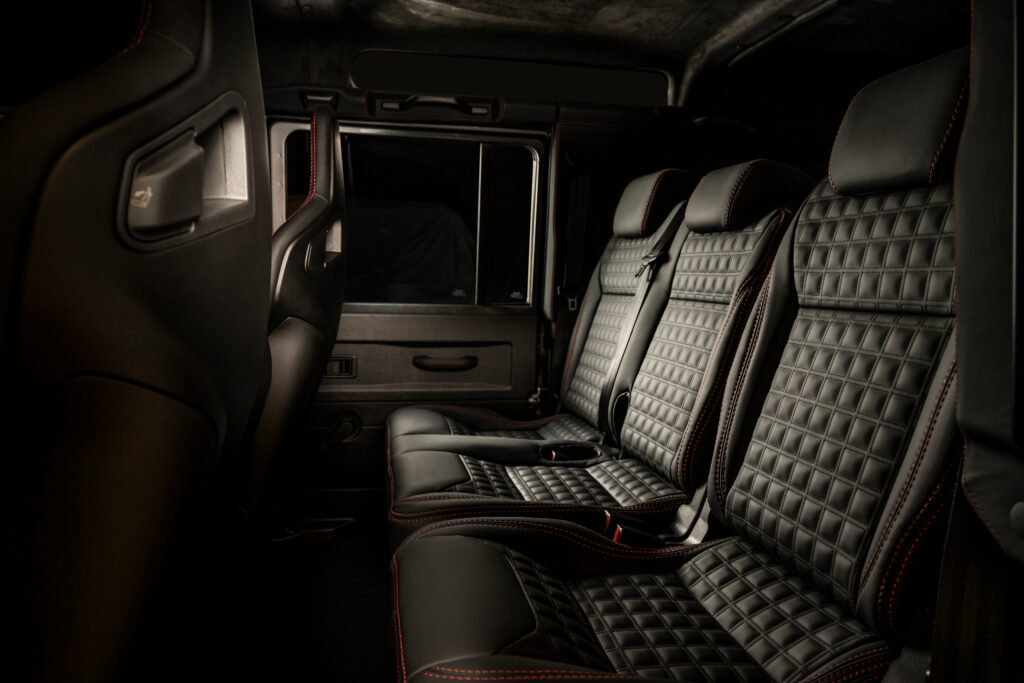 Inside the vehicle has been completely re-worked beginning with extensive body sealing, panel alignment and finally soundproofing to every surface before being topped with premium grade Ebony carpet. Seating for 7 comes by way of Twisted trimmed Recaro front seats, 60/40 middle row and two forward facing rear seats all in sumptuous Ebony leather with Racing Red square quilt detailing. Aside from the leather works, the interior plastics have been afforded our tactile soft touch finish alongside our Twisted classic leather clad steering wheel. Entertainment is provided by way of our double din infotainment screen and signature 8 channel audio, meaning that podcasts, radio or Spotify are delivered with clarity never before heard in a Land Rover Defender.