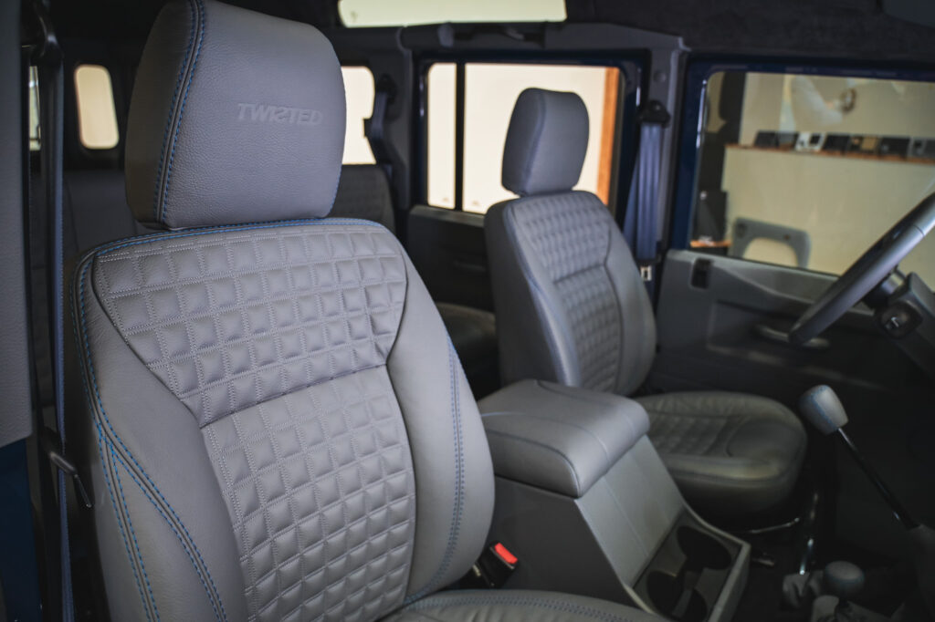 The engine has been disassembled, thoroughly inspected, and completely rebuilt and the driveline upgraded with new driveshafts, half shafts, and differentials. Our Twisted developed intercooler, stainless steel exhaust, hybrid turbocharger, and engine remap were added taking the car from its original; 122hp to 210hp. Stopping power has not been forgotten, and our 6-piston front and 4-piston rear calipers are installed giving a massive upgrade over the standard Land Rover offerings. The original 5-cylinder TD5 engine provides the most wonderful and unmistakable soundtrack.
